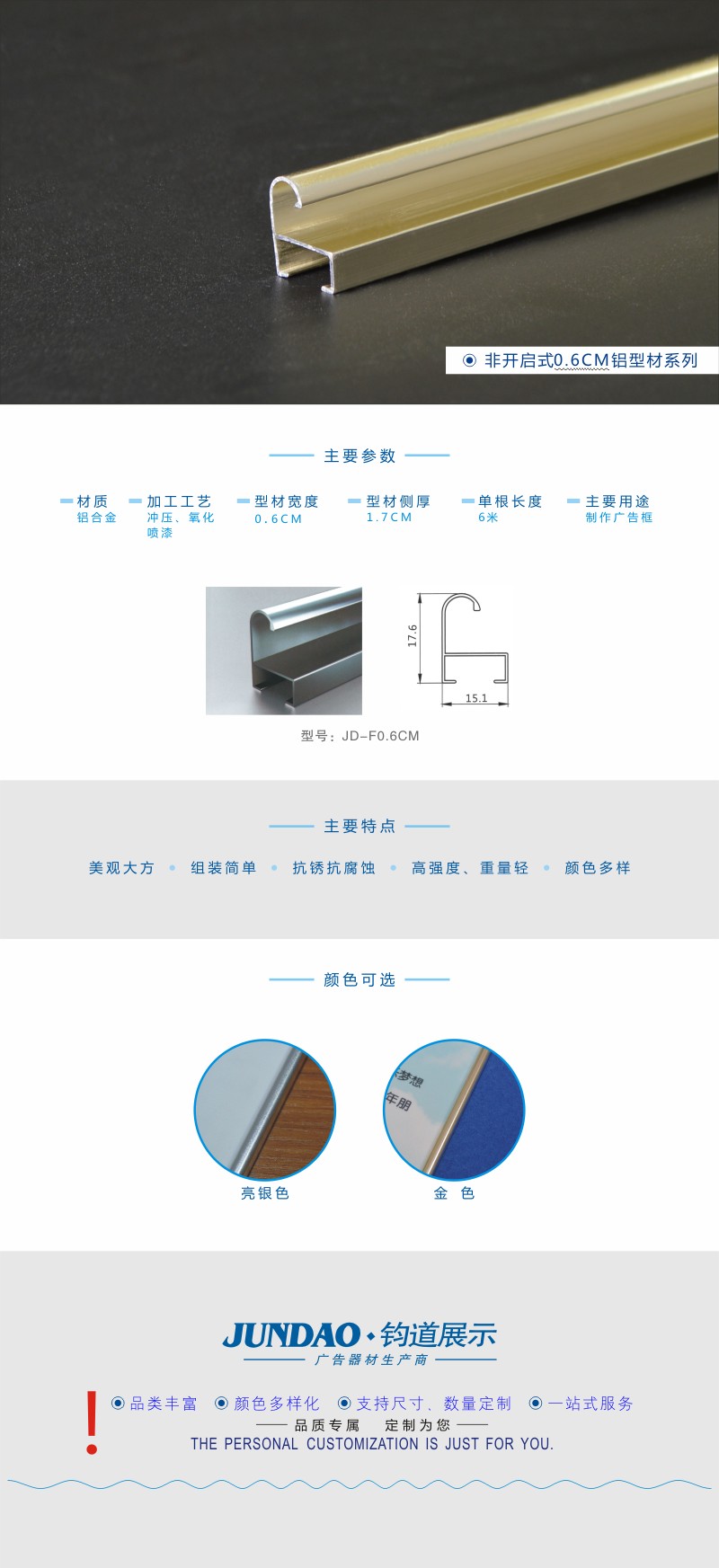 0.6CM亮金色非开启式广告框型材/铝合金展示框