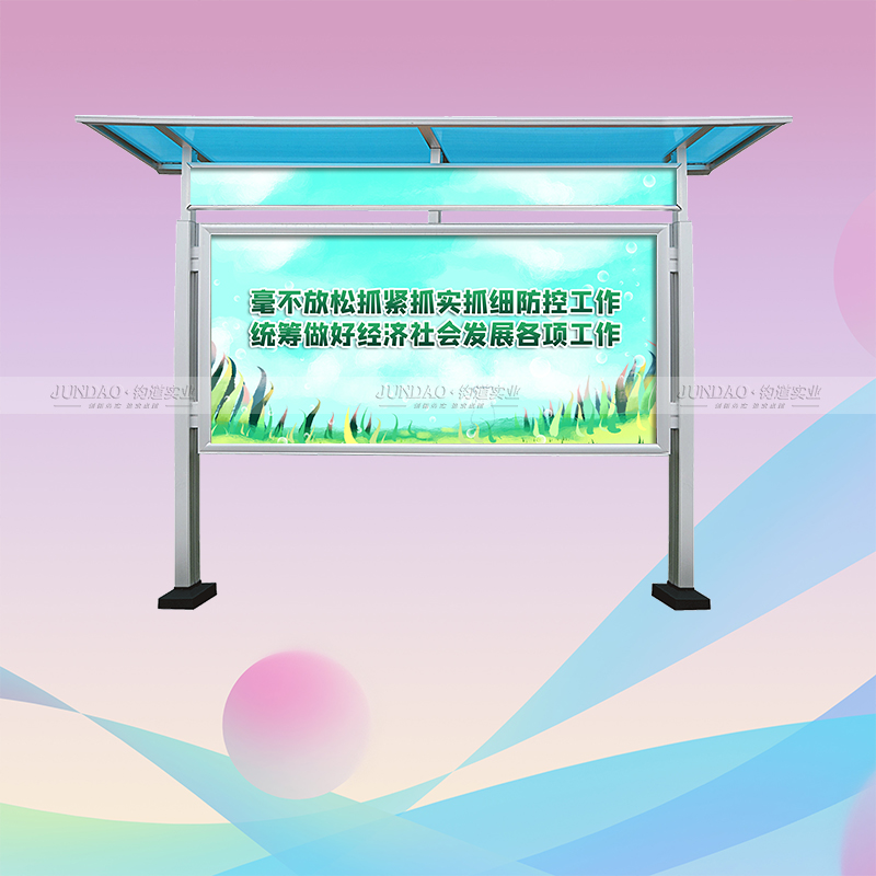 河南钧道实业有限公司主营:铝合金户外带雨棚宣传栏、垃圾分类亭、挂墙报栏、移动展架、广告铝框、可折叠海报架、灯杆道旗、带造型灯杆灯箱、标识牌、花草牌等成品。