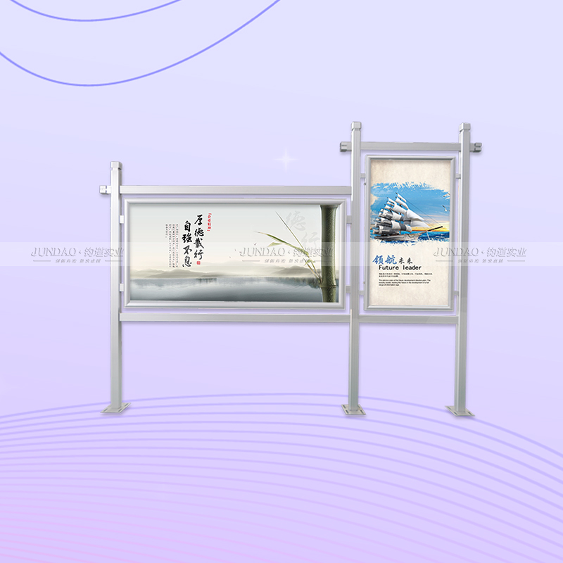 河南钧道实业有限公司主营:铝合金户外带雨棚宣传栏、垃圾分类亭、挂墙报栏、移动展架、广告铝框、可折叠海报架、灯杆道旗、带造型灯杆灯箱、标识牌、花草牌等成品。