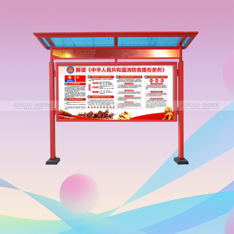 其次,还要看宣传栏安装的地点不同的地点所需要的宣传栏设计方案不同。如果安装在户外,需要考虑宣传栏的制作材料、宣传栏结构,还要考虑雨雪天气腐蚀,外部风沙影响等。一般采用玻璃顶棚,通过镀锌板、不锈钢外部框架与玻璃之间的搭配,能够防止宣传栏受到恶劣天气影响。如果是室内悬挂,则需要考虑室内布置位置,还要考虑宣传栏所涉及的内容。针对内部管理信息的宣传,可以采取墙面框架悬挂的模式,还可以采取X展架摆放的模式,针对相关政策的宣传,可以采取木制模式塑造创意形状,来提升单位整体形象。