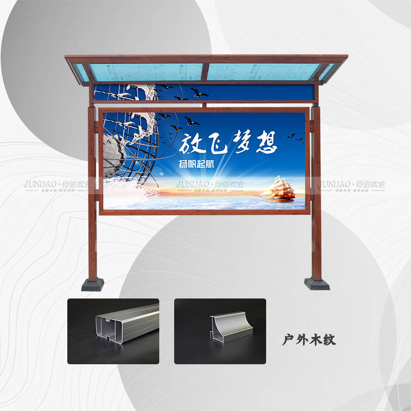 河南钧道实业有限公司主营:铝合金户外带雨棚宣传栏、垃圾分类亭、挂墙报栏、移动展架、广告铝框、可折叠海报架、灯杆道旗、带造型灯杆灯箱、标识牌、花草牌等成品。