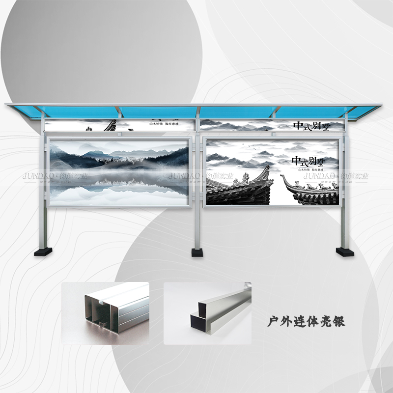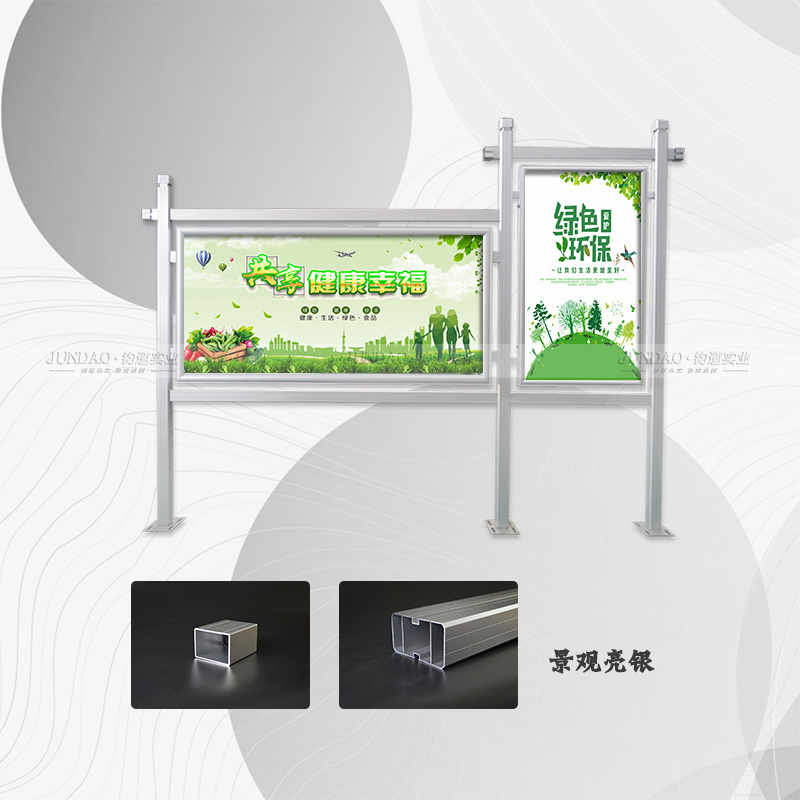 河南钧道实业有限公司主营:铝合金户外带雨棚宣传栏、垃圾分类亭、挂墙报栏、移动展架、广告铝框、可折叠海报架、灯杆道旗、带造型灯杆灯箱、标识牌、花草牌等成品。