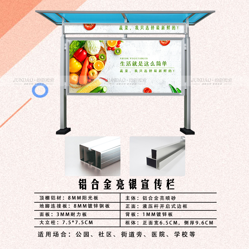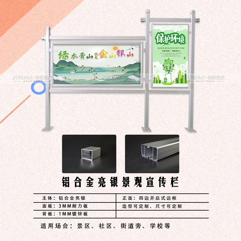 河南钧道实业有限公司主营:铝合金户外带雨棚宣传栏、垃圾分类亭、挂墙报栏、移动展架、广告铝框、可折叠海报架、灯杆道旗、带造型灯杆灯箱、标识牌、花草牌等成品。