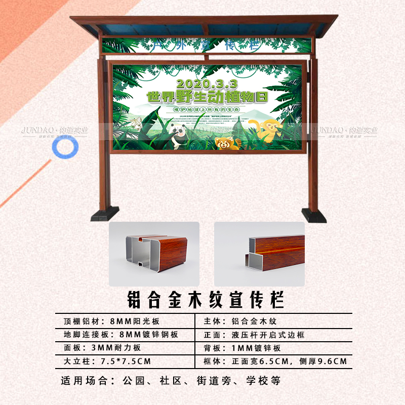 河南钧道实业有限公司主营:铝合金户外带雨棚宣传栏、垃圾分类亭、挂墙报栏、移动展架、广告铝框、可折叠海报架、灯杆道旗、带造型灯杆灯箱、标识牌、花草牌等成品。