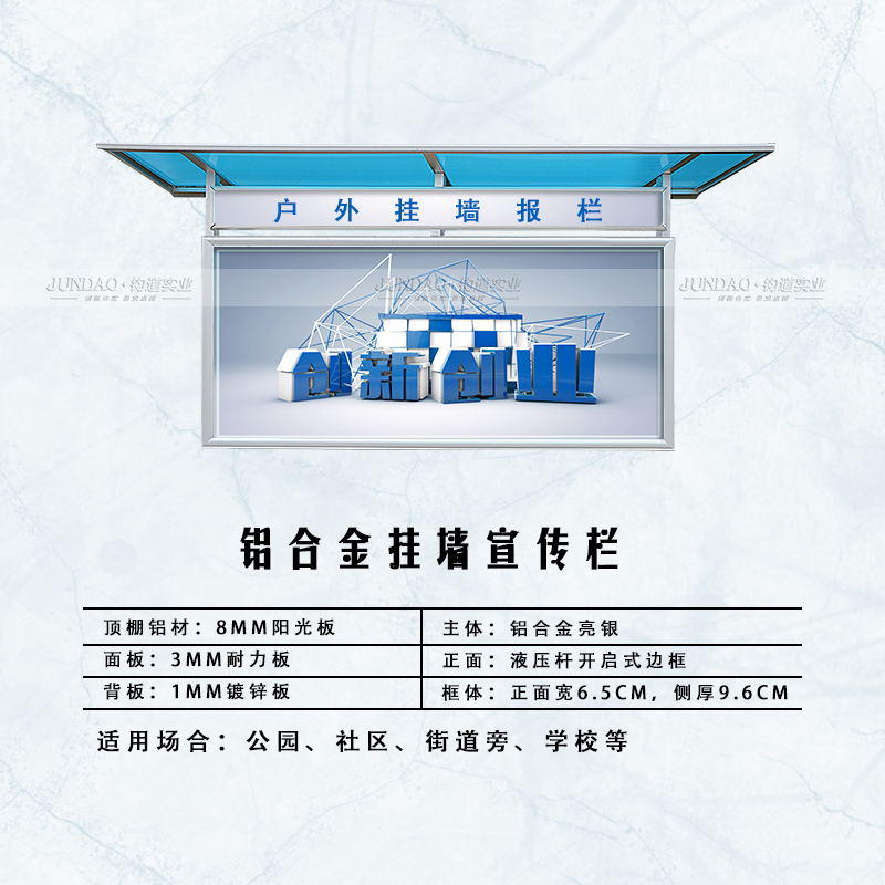 河南钧道实业有限公司主营:铝合金户外带雨棚宣传栏、垃圾分类亭、挂墙报栏、移动展架、广告铝框、可折叠海报架、灯杆道旗、带造型灯杆灯箱、标识牌、花草牌等成品。