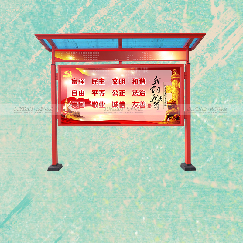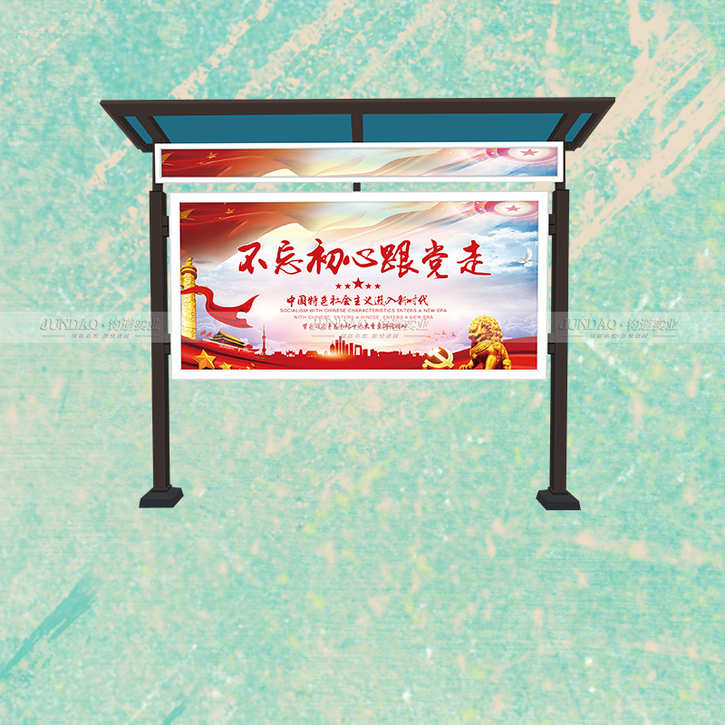 河南钧道实业有限公司主营:铝合金户外带雨棚宣传栏、垃圾分类亭、挂墙报栏、移动展架、广告铝框、可折叠海报架、灯杆道旗、带造型灯杆灯箱、标识牌、花草牌等成品。
