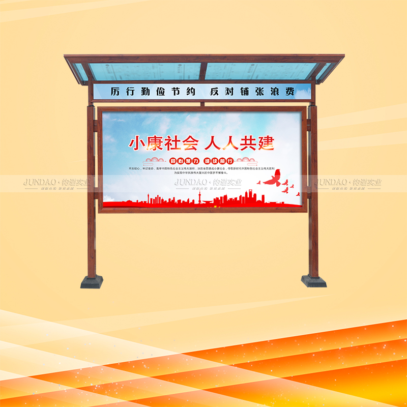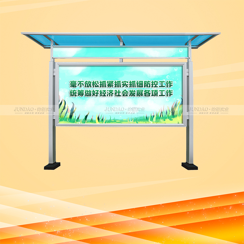 河南钧道实业有限公司主营:铝合金户外带雨棚宣传栏、垃圾分类亭、挂墙报栏、移动展架、广告铝框、可折叠海报架、灯杆道旗、带造型灯杆灯箱、标识牌、花草牌等成品。