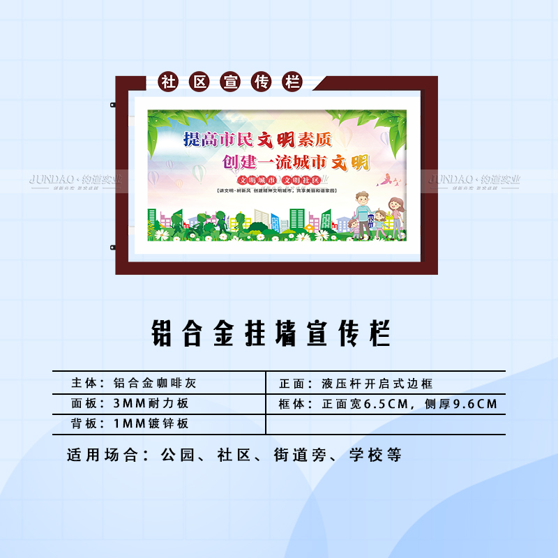 河南钧道实业有限公司主营:铝合金户外带雨棚宣传栏、垃圾分类亭、挂墙报栏、移动展架、广告铝框、可折叠海报架、灯杆道旗、带造型灯杆灯箱、标识牌、花草牌等成品。