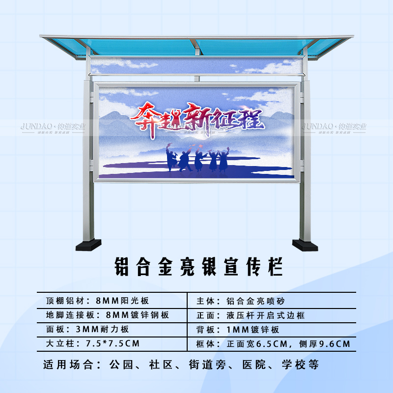 河南钧道实业有限公司主营:铝合金户外带雨棚宣传栏、垃圾分类亭、挂墙报栏、移动展架、广告铝框、可折叠海报架、灯杆道旗、带造型灯杆灯箱、标识牌、花草牌等成品。