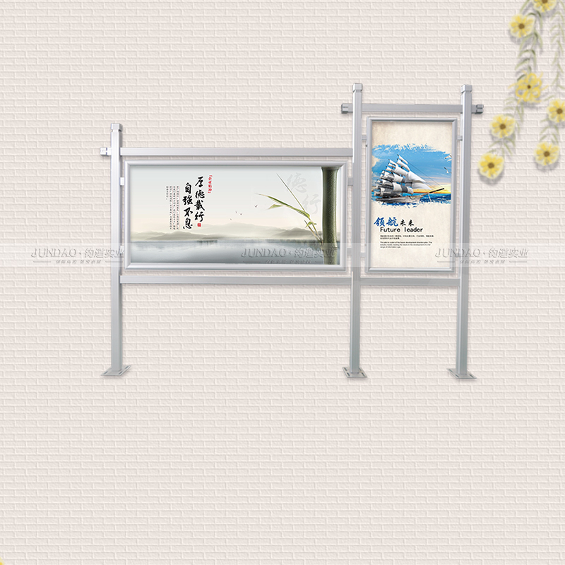 河南钧道实业有限公司主营:铝合金户外带雨棚宣传栏、垃圾分类亭、挂墙报栏、移动展架、广告铝框、可折叠海报架、灯杆道旗、带造型灯杆灯箱、标识牌、花草牌等成品。