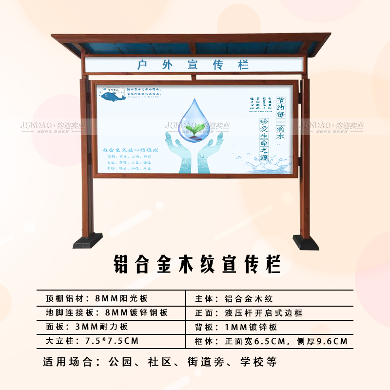 河南钧道实业有限公司主营:铝合金户外带雨棚宣传栏、垃圾分类亭、挂墙报栏、移动展架、广告铝框、可折叠海报架、灯杆道旗、带造型灯杆灯箱、标识牌、花草牌等成品。
