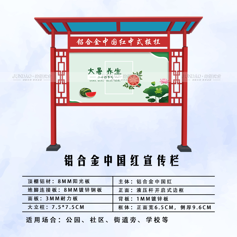 河南钧道实业有限公司主营:铝合金户外带雨棚宣传栏、垃圾分类亭、挂墙报栏、移动展架、广告铝框、可折叠海报架、灯杆道旗、带造型灯杆灯箱、标识牌、花草牌等成品。