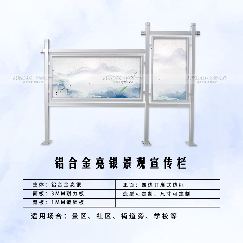 河南钧道实业有限公司主营:铝合金户外带雨棚宣传栏、垃圾分类亭、挂墙报栏、移动展架、广告铝框、可折叠海报架、灯杆道旗、带造型灯杆灯箱、标识牌、花草牌等成品。