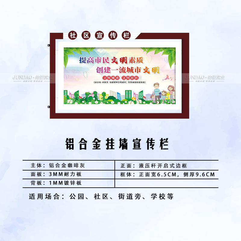 河南钧道实业有限公司主营:铝合金户外带雨棚宣传栏、垃圾分类亭、挂墙报栏、移动展架、广告铝框、可折叠海报架、灯杆道旗、带造型灯杆灯箱、标识牌、花草牌等成品。