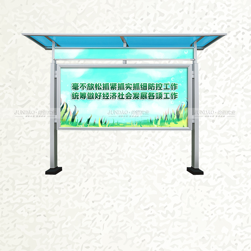 河南钧道实业有限公司主营:铝合金户外带雨棚宣传栏、垃圾分类亭、挂墙报栏、移动展架、广告铝框、可折叠海报架、灯杆道旗、带造型灯杆灯箱、标识牌、花草牌等成品。