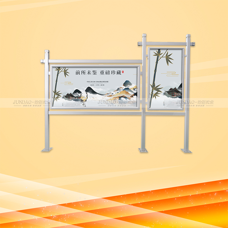 河南钧道实业有限公司主营:铝合金户外带雨棚宣传栏、垃圾分类亭、挂墙报栏、移动展架、广告铝框、可折叠海报架、灯杆道旗、带造型灯杆灯箱、标识牌、花草牌等成品。