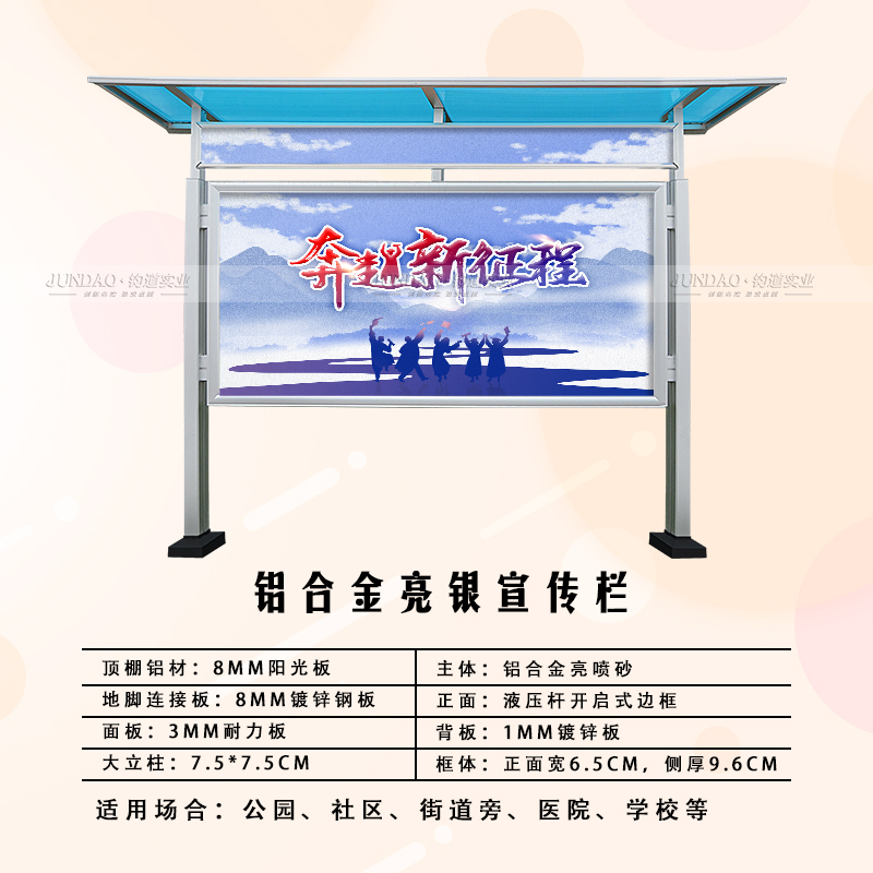 河南钧道实业有限公司主营:铝合金户外带雨棚宣传栏、垃圾分类亭、挂墙报栏、移动展架、广告铝框、可折叠海报架、灯杆道旗、带造型灯杆灯箱、标识牌、花草牌等成品。