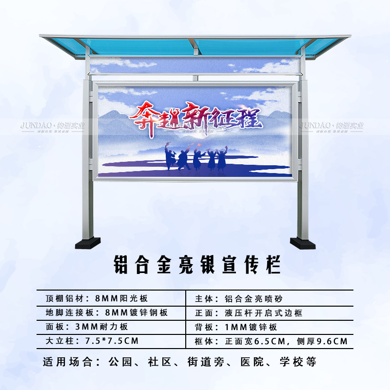 河南钧道实业有限公司主营:铝合金户外带雨棚宣传栏、垃圾分类亭、挂墙报栏、移动展架、广告铝框、可折叠海报架、灯杆道旗、带造型灯杆灯箱、标识牌、花草牌等成品。