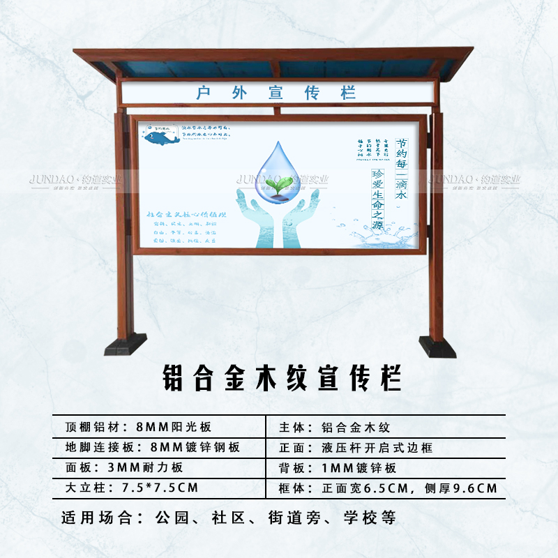河南钧道实业有限公司主营:铝合金户外带雨棚宣传栏、垃圾分类亭、挂墙报栏、移动展架、广告铝框、可折叠海报架、灯杆道旗、带造型灯杆灯箱、标识牌、花草牌等成品。