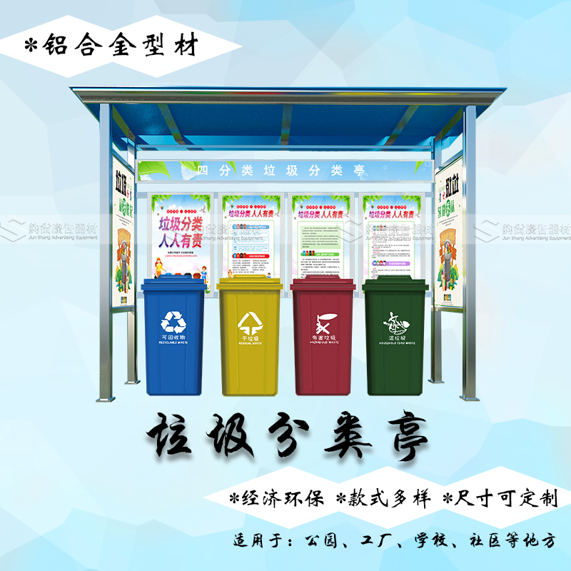 3.垃圾分类亭安装方便,组装完成后美观大方,前开启式结构,轻松开启,换画方便,操作简单