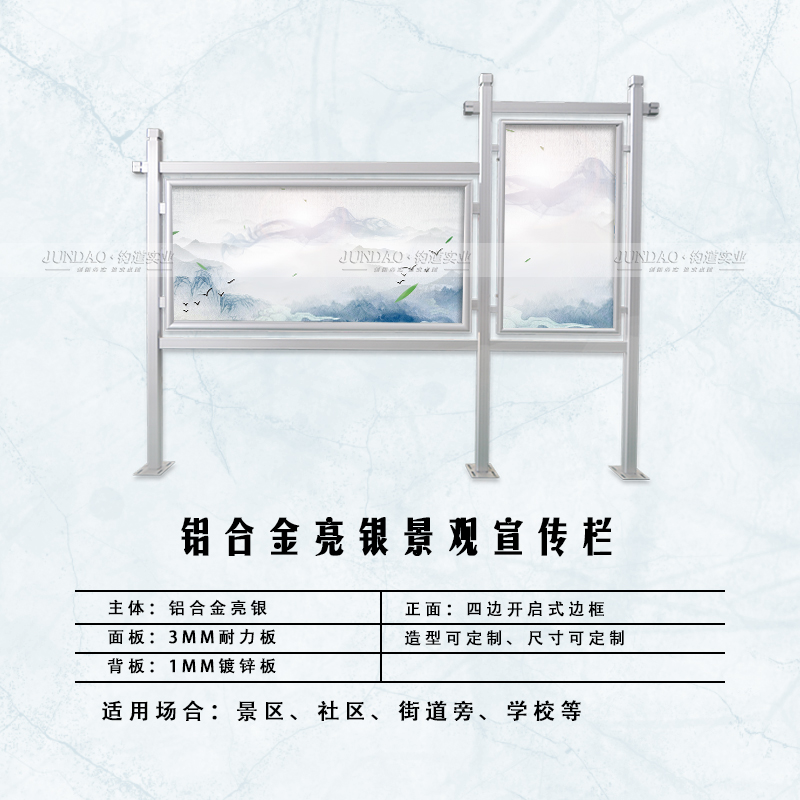 河南钧道实业有限公司主营;铝合金户外带雨棚宣传栏、垃圾分类亭,挂墙报栏、移动展架、开启式非开启式铝框、可折叠海报架、灯杆道旗、带造型灯杆灯箱、超薄灯箱、卡布拉布灯箱等成品。
