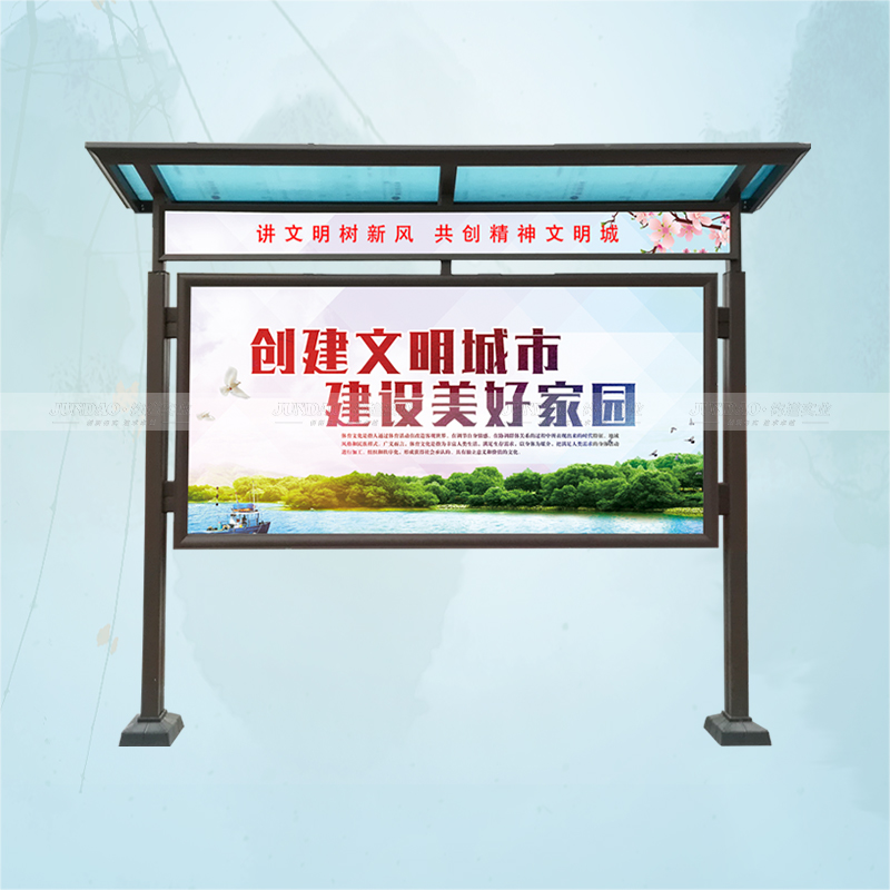 现在是21世纪,宣传栏制造有了突飞猛进的发展,主要有镀锌板、铝合金等材质折弯焊接而成,表面具有超强的抗锈蚀、抗腐蚀能力。郑州钧道广告器材有限公司设计、研发、制作的宣传栏全部采用国标镀锌板和铝合金,厚度都是足1.5mm~2mm。顶棚采用2mm的阳光板,安全性高,显示效果清晰,透光度高。不光材质好,造型也多种多样,有古典的,现代的,时尚的和小清新的,色彩之艳丽,造型之流畅,彻底改变了宣传栏呆板老旧的印象。真正成为了城市美化不可缺少的一道亮丽风景线!