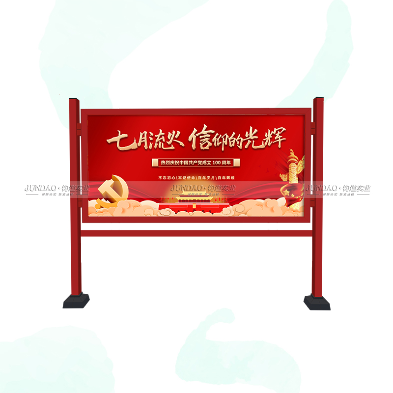 河南钧道实业有限公司主营:铝合金户外带雨棚宣传栏、垃圾分类亭、挂墙报栏、移动展架、广告铝框、可折叠海报架、灯杆道旗、带造型灯杆灯箱、党建标识牌、花草牌等成品。