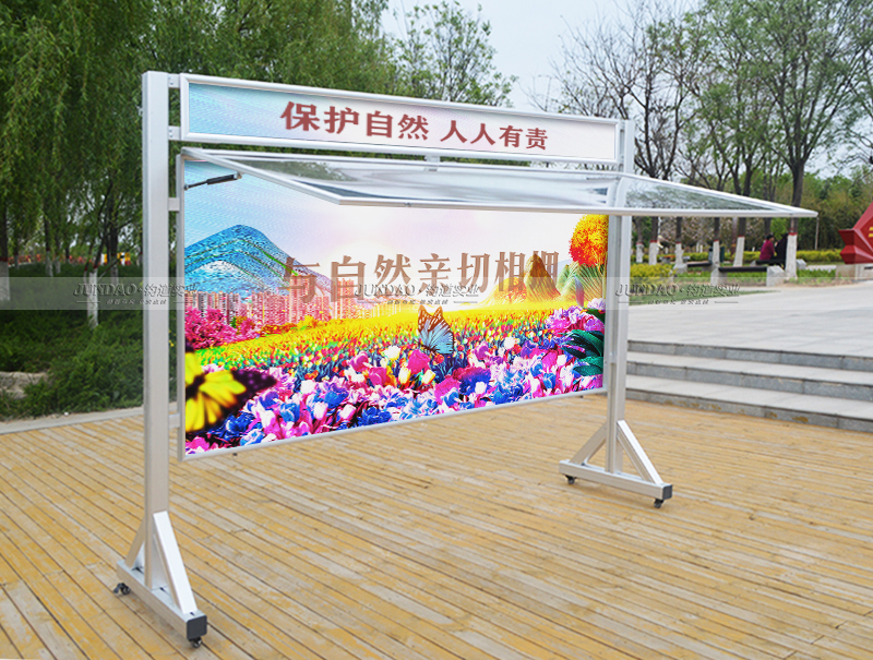 河南钧道实业有限公司主营:铝合金户外带雨棚宣传栏、垃圾分类亭、挂墙报栏、移动展架、广告铝框、可折叠海报架、灯杆道旗、带造型灯杆灯箱、党建标识牌、花草牌等成品。