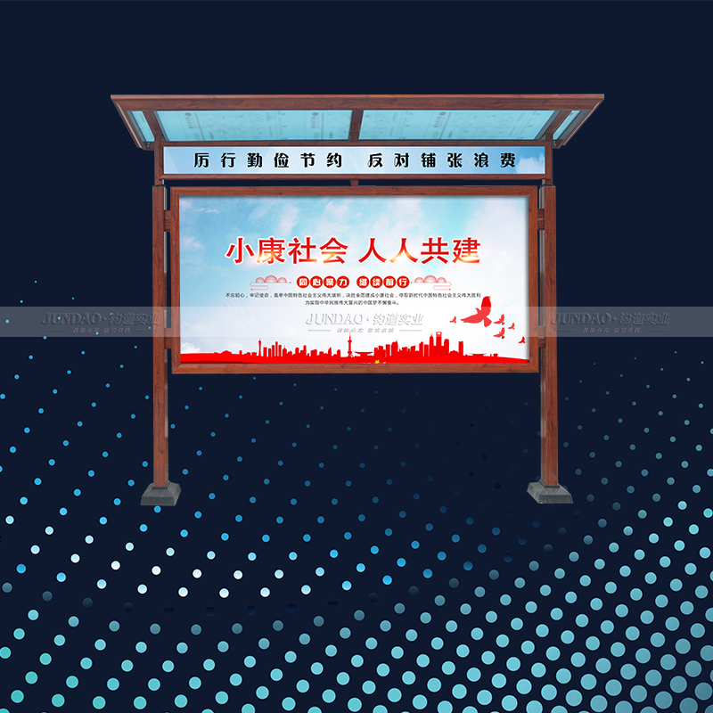 河南钧道实业有限公司主营:铝合金户外带雨棚宣传栏、垃圾分类亭、挂墙报栏、移动展架、广告铝框、可折叠海报架、灯杆道旗、带造型灯杆灯箱、标识牌、花草牌等成品。