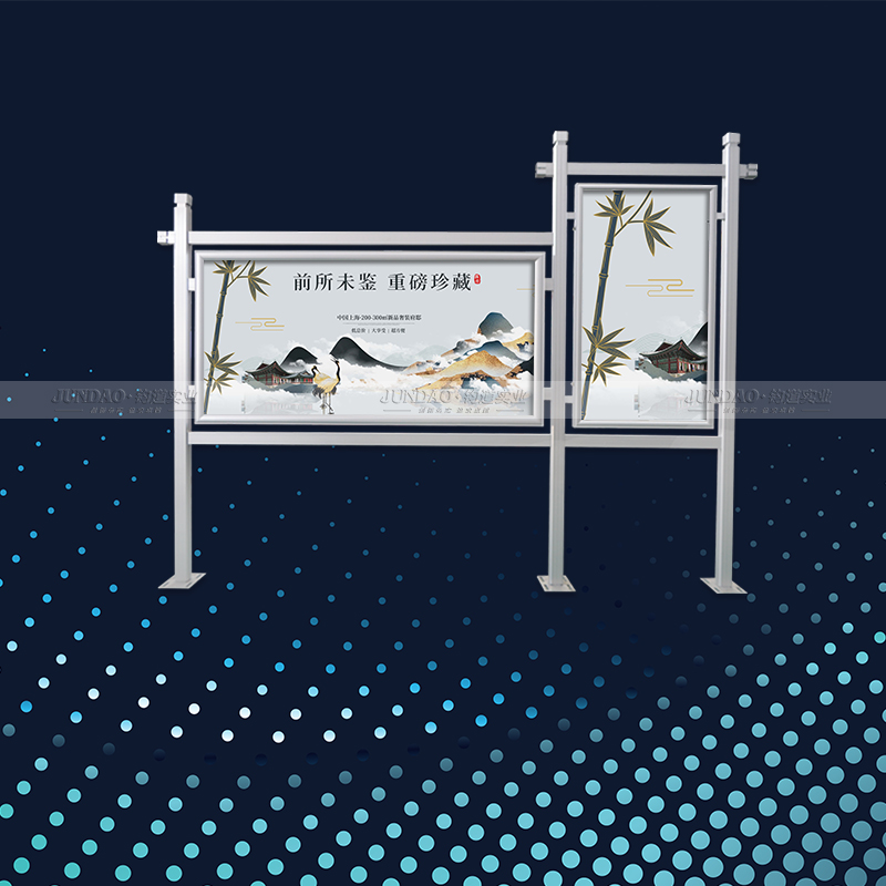 河南钧道实业有限公司主营:铝合金户外带雨棚宣传栏、垃圾分类亭、挂墙报栏、移动展架、广告铝框、可折叠海报架、灯杆道旗、带造型灯杆灯箱、标识牌、花草牌等成品。