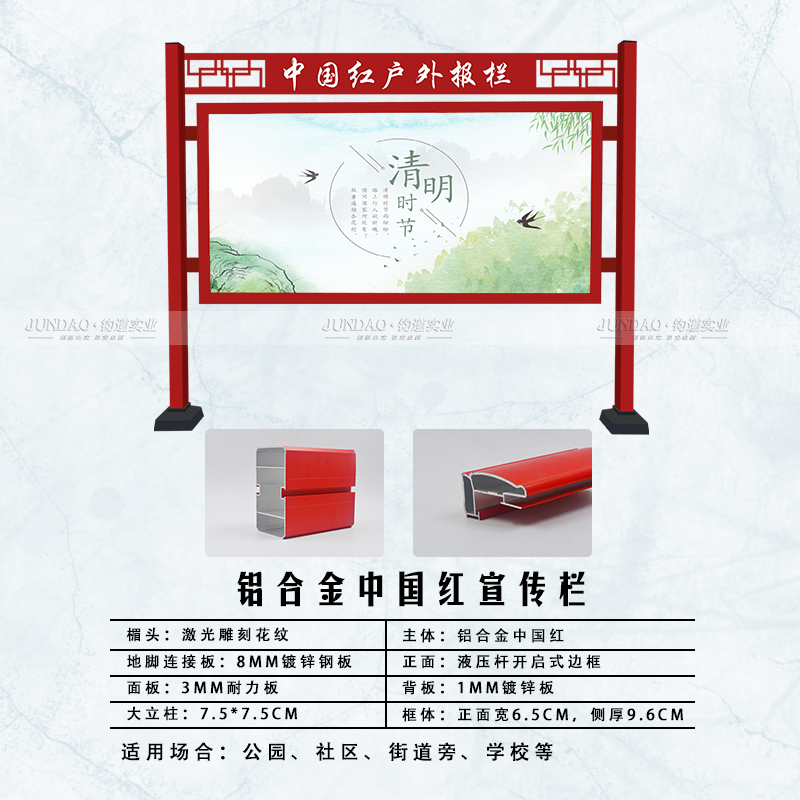 河南钧道实业有限公司主营;铝合金户外带雨棚宣传栏、垃圾分类亭,挂墙报栏、移动展架、开启式非开启式铝框、可折叠海报架、灯杆道旗、带造型灯杆灯箱、超薄灯箱、卡布拉布灯箱等成品。